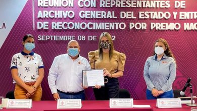 • El director general del Archivo General del Estado, Martín de Jesús Aguilar Palacios, entrega reconocimiento a la presidenta Rosy…