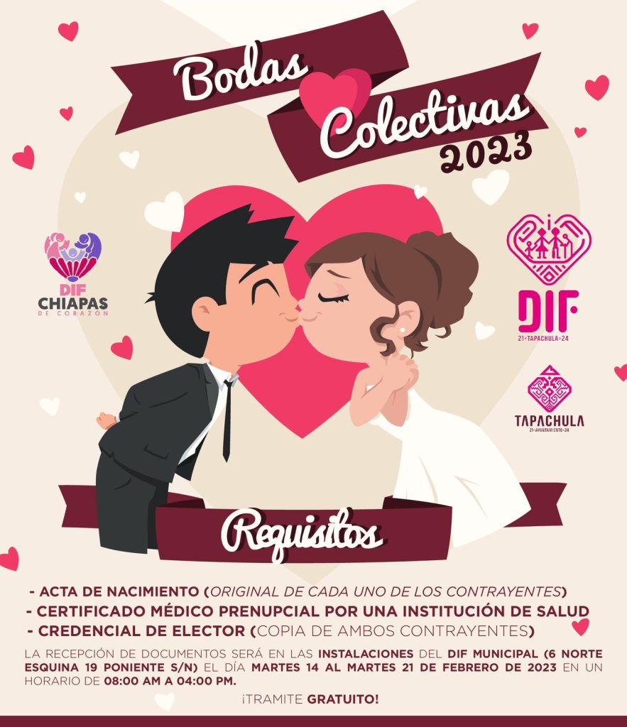 Es importante que las personas interesadas acudan a dejar la documentación correspondiente que se requiere previo a la celebración de la boda colectiva. Lo que se solicita es acta de nacimiento actualizada de cada uno de los contrayentes, certificado médico expedido por una institución de salud pública (IMSS, ISSSTE o Centro de Salud), así como copias de la credencial de elector de los contrayentes.